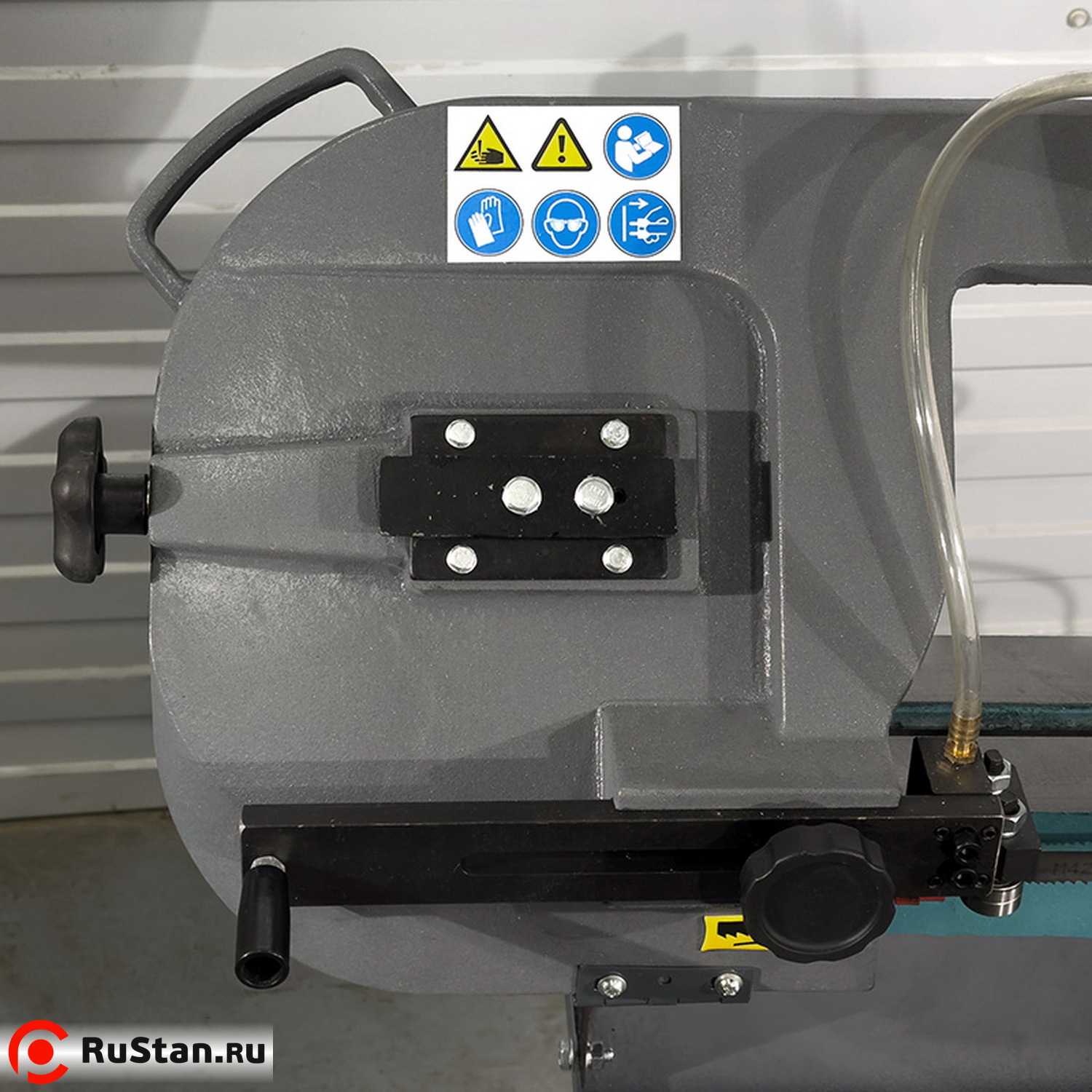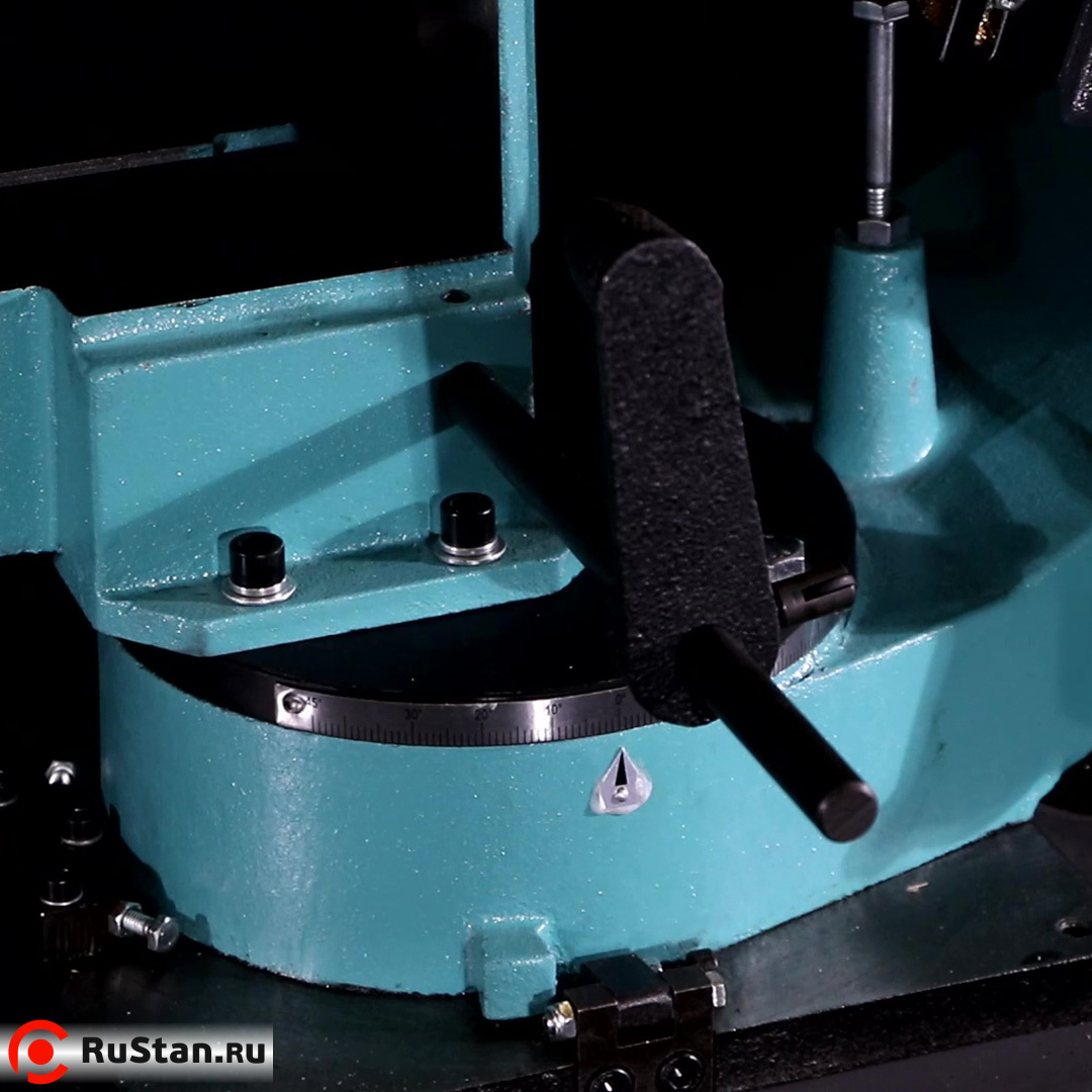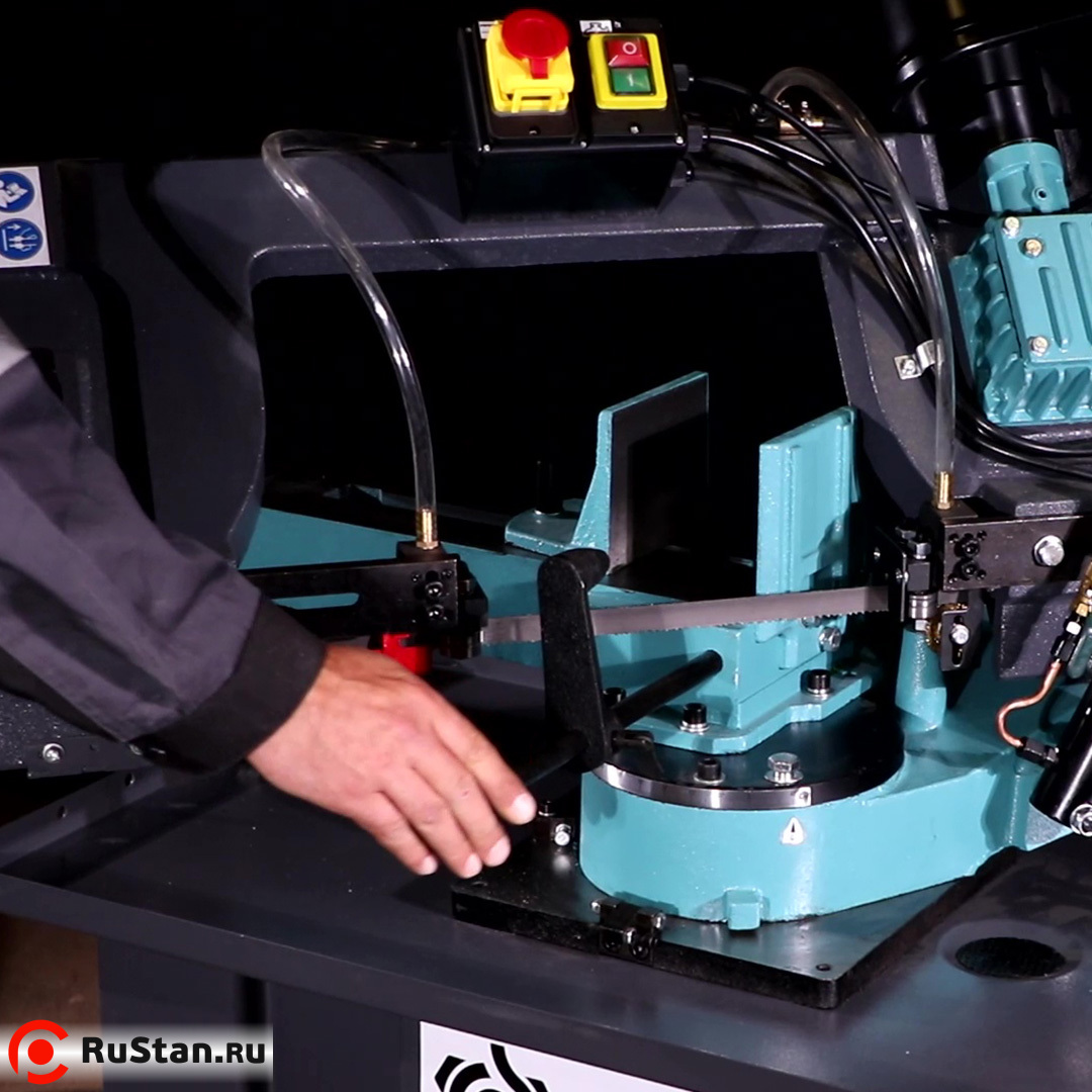 Скорость опускания пильной рамы можно регулировать гидроцилиндром. Модель оснащена системой подачи в зону резания смазочно-охлаждающей жидкости (СОЖ).