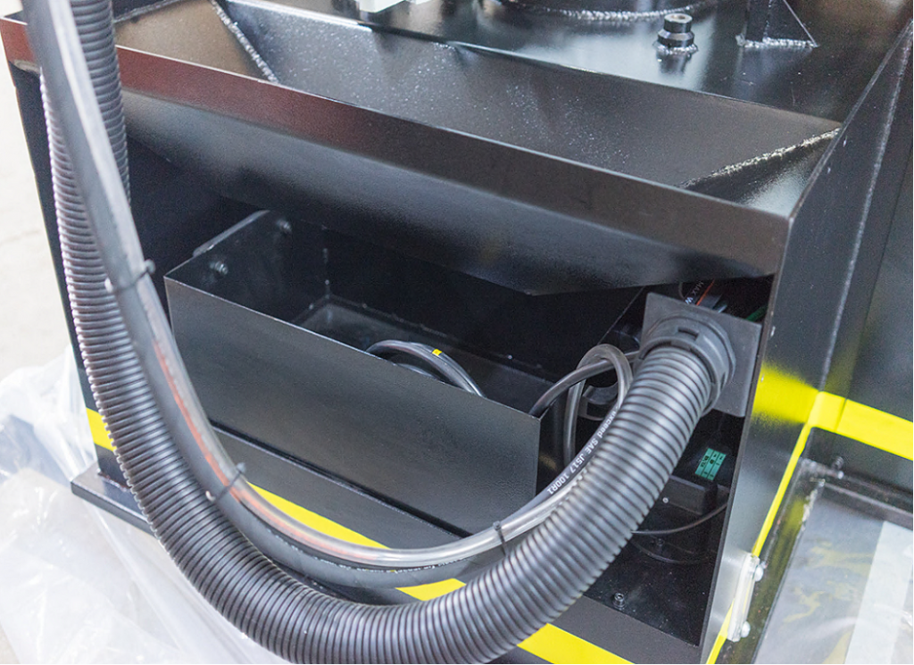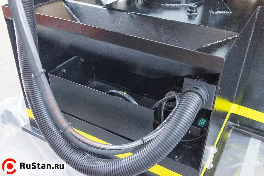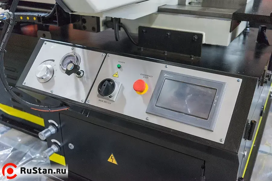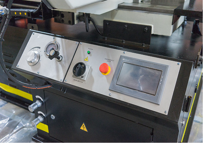 Панель управления встроена в тумбу станка. Длина подачи заготовки контролируется автоматически c ЧПУ (СNC). ЧПУ станка строится на PLC контроллере. Сенсорный дисплей управления.