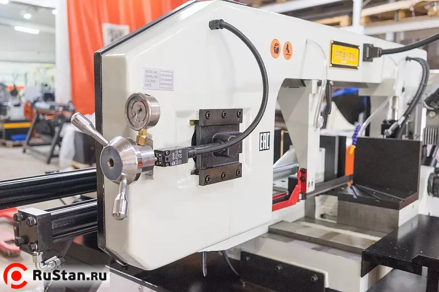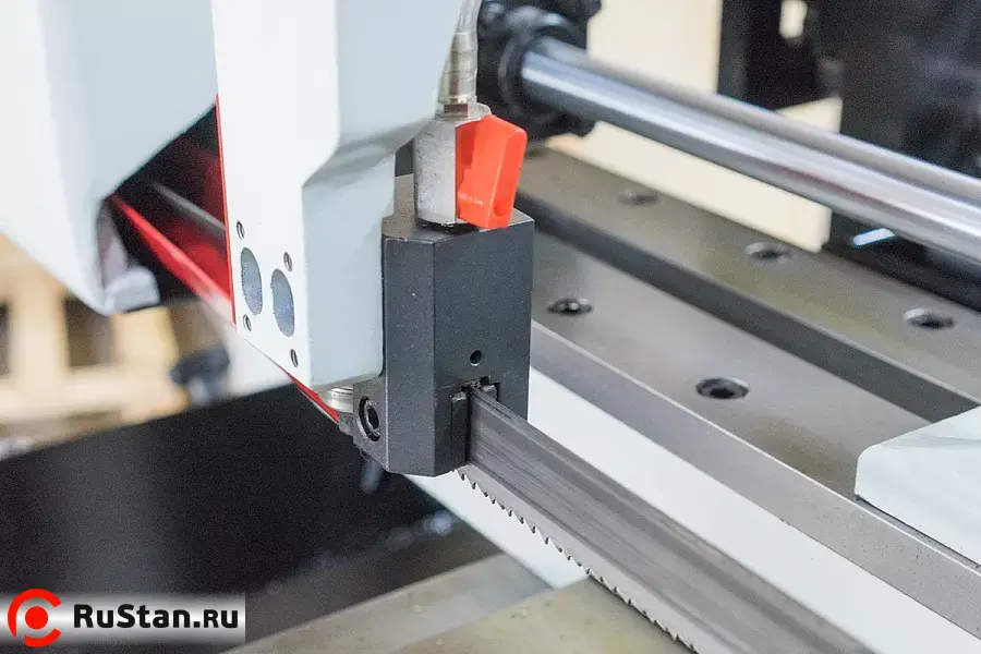 На автоматических станках возможна работа как в ручном режиме (каждая операция выполняется вручную посредством нажатия соответствующей кнопки), так и в автоматическом режиме, когда станок выполняет весь цикл резания: зажим заготовки – подвод заготовки – запуск пилы – опускание рамы – остановка пилы – подъем рамы – отжим тисков. В автоматическом режиме оператору необходимо лишь обеспечить подачу заготовок, предварительно настроить концевой ограничитель на необходимую длину получаемых заготовок и запустить цикл пиления кнопкой «Пуск».