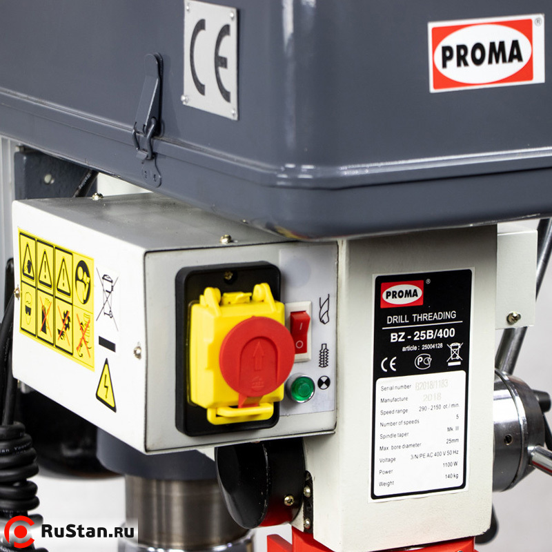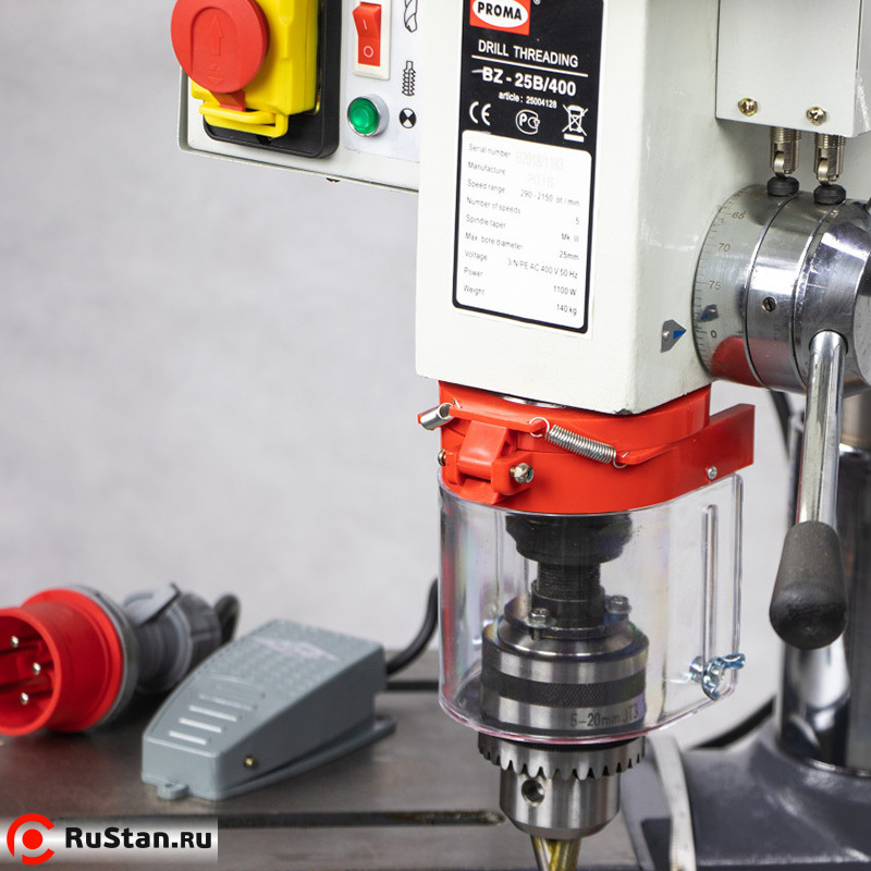 Промышленный сверлильный станок с функцией резьбонарезания PROMA BZ-25B/400 имеет удлиненный ход шпинделя, а также наличие переключателя основных режимов (режим сверления — режим нарезания резьбы), который делает работу на станке более удобной. Кроме того, станок оснащен шестиполюсным электродвигателем повышенной мощности.